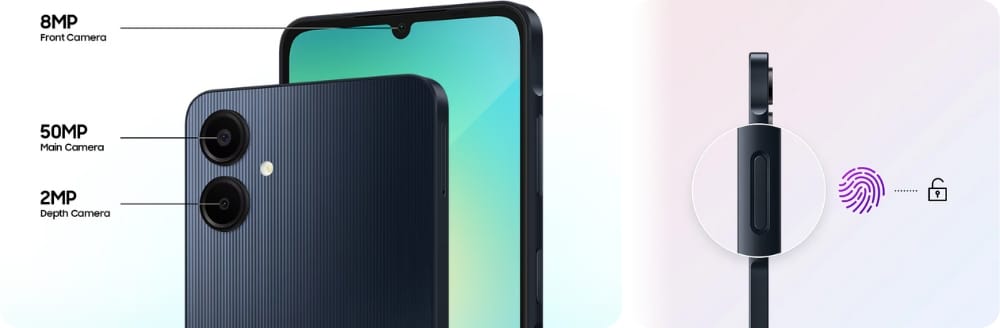 Galaxy A06 оснащений процесором MediaTek G85 та вбудованою пам'яттю для комфортної гри, стримінгового відео та перегляду соцмереж. Основна камера з роздільною здатністю 50 МП робить приголомшливі фотографії, а батарея ємністю 5 000 мА∙год забезпечує тривалу автономну роботу. Насолоджуйтеся багатозадачністю з додатковою пам'яттю.