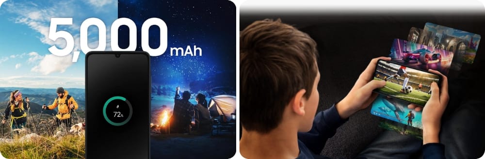 Насолоджуйтесь улюбленими речами, не турбуючись, що смартфон швидко розрядиться. Galaxy A06 працює довше на одному заряді батареї ємністю 5 000 мА∙год (типова). А завдяки функції швидкої зарядки потужністю 25 Вт ваш гаджет швидко повертатиметься до роботи.