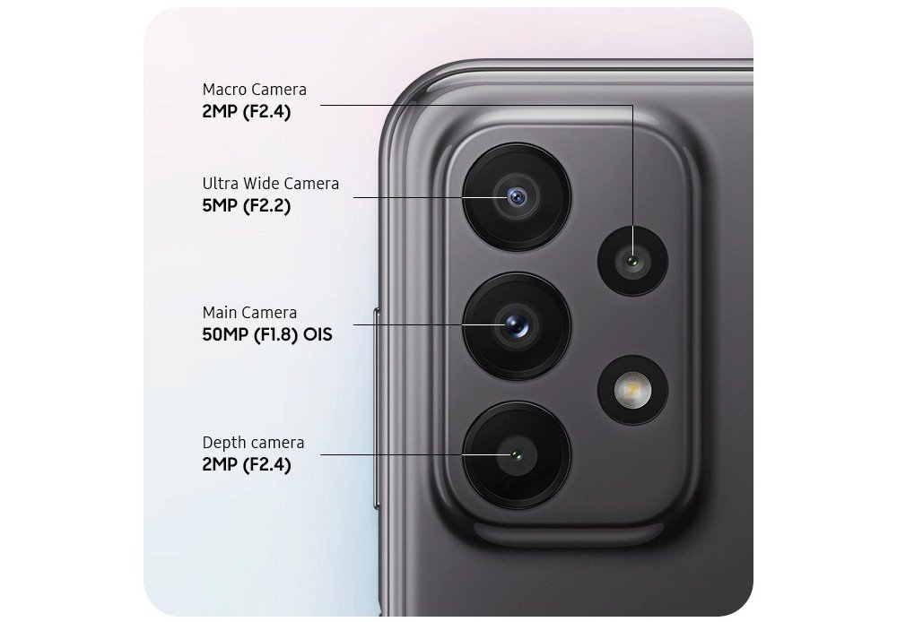 Прості витончені вигини Ambient Edge бездоганно з'єднують камеру з корпусом Galaxy A23. Тонкий та симетричний смартфон Galaxy A23 виконаний у чорному, білому, блакитному та персиковому кольорах.