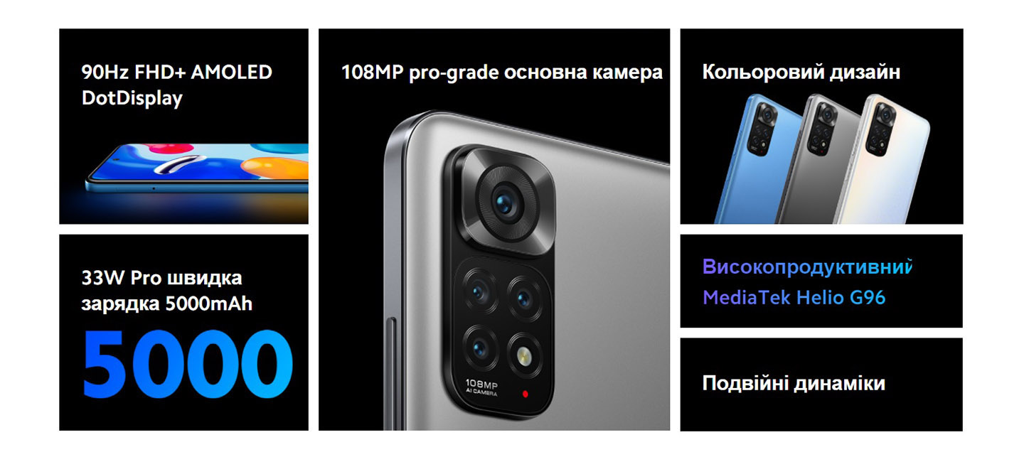 Оцініть лідерські якості Redmi Note 11S. Насолоджуйтесь суперчітким та плавним зображенням на 6.43-дюймовому FHD+ AMOLED-дисплеї з частотою оновлення 90 Гц. Потужний процесор MediaTek Helio G96 дозволяє легко вирішувати будь-які ємні завдання. Основна камера 108 Мп зберігає всі пам'ятні моменти у найдрібніших подробицях. Потужна зарядка 33 Вт за лічені хвилини може зарядити батарею на кілька годин роботи.
