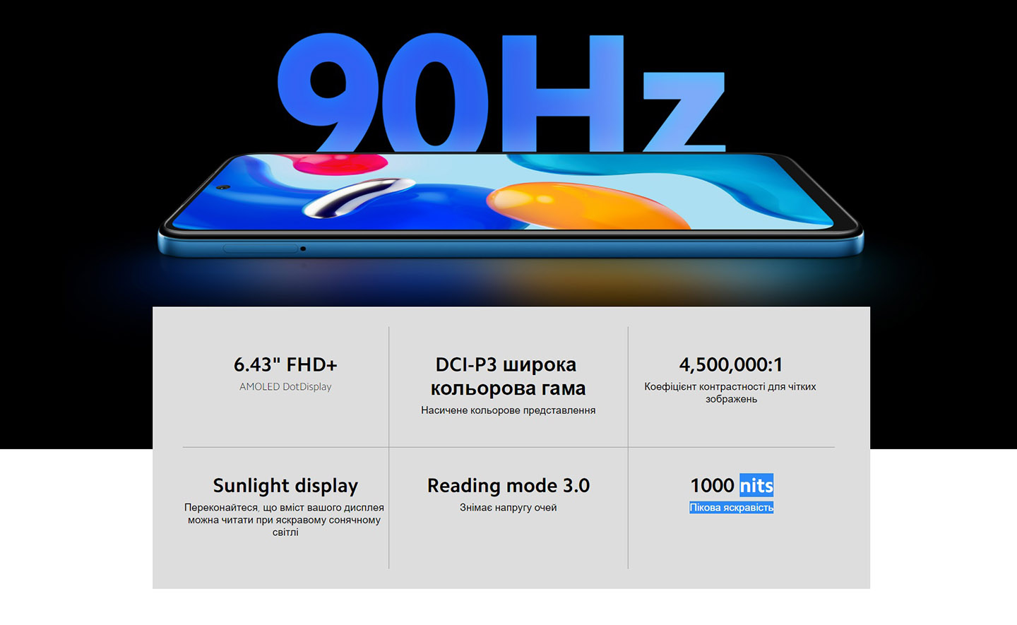 Дисплей Redmi Note 11S із частотою оновлення 90 Гц точно і чітко відтворює будь-який контент, забезпечує плавний скролінг та чудову якість картинки у динамічних сценаріях. Розширений колірний діапазон DCI-P3 надає кольорам унікальну яскравість та насиченість. А датчики освітлення подбають про те, щоб вам було зручно користуватися телефоном навіть на яскравому сонці.
