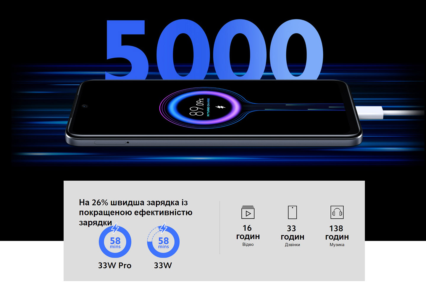 Швидка зарядка потужністю 33 Вт до 26% скорочує час підзарядки та повністю справляється із завданням всього за 58 хвилин, а технології Mi FC+MMT роблять процес підзарядки максимально ефективним. Батарея ємністю 5000 мАг гарантує, що ви зможете активно спілкуватись та розважатись цілий день. Ви зможете користуватися смартфоном у режимі розмови до 33 годин або дивитися відео до 16 години без перерви на підзарядку.