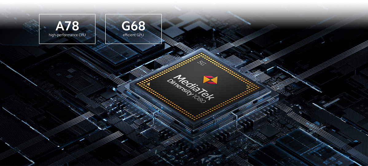 Потужний 6нм процесор MediaTek Dimensity 1080 c 5G та до 8 Гб ОЗУ LPDDR4Х забезпечують приріст продуктивності та пропускної спроможності системи. Для смартфона не існує нездійсненних завдань, він легко справляється з ресурсомісткими додатками і будь-якими вимогливими іграми. А до 256 Гб вбудованої пам'яті дозволяють зберігати величезну кількість музики, фото та відео.