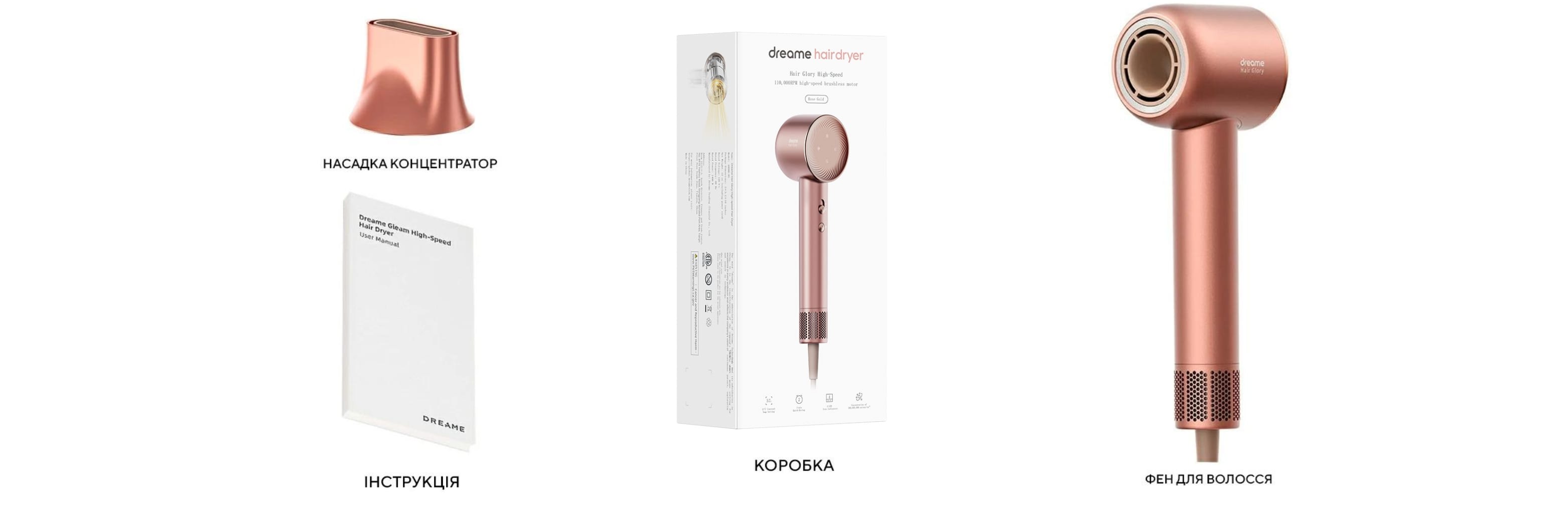 З коробки фен Dreame Hair Dryer Glory поставляється з деякими компонентами: насадка концентратор, інструкція із застосування та гарантійний талон від виробника. Фен поставляється у фірмовій коробці, яка має презентабельний вигляд, що дозволяє використовувати девайс як чудовий подарунок.