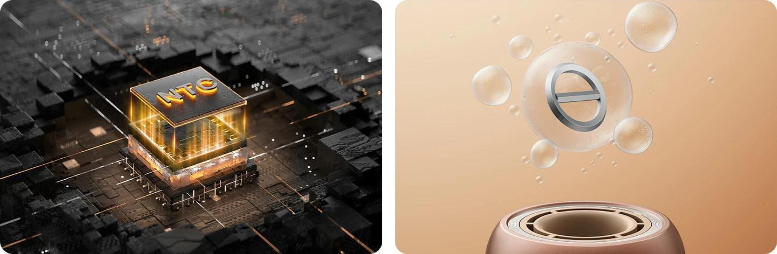 Ця температура ретельно контролюється вбудованим модулем NTC, який регулює нагрівання повітря під час роботи. Така система позбавить вас від ризиків перегріву волосся і гарантує подачу підігрітого повітря статичної температури. Сушка та укладання з однаковою температурою повітря позитивно впливають на блиск волосся, здоров'я, еластичність і стан кутикули волосків.