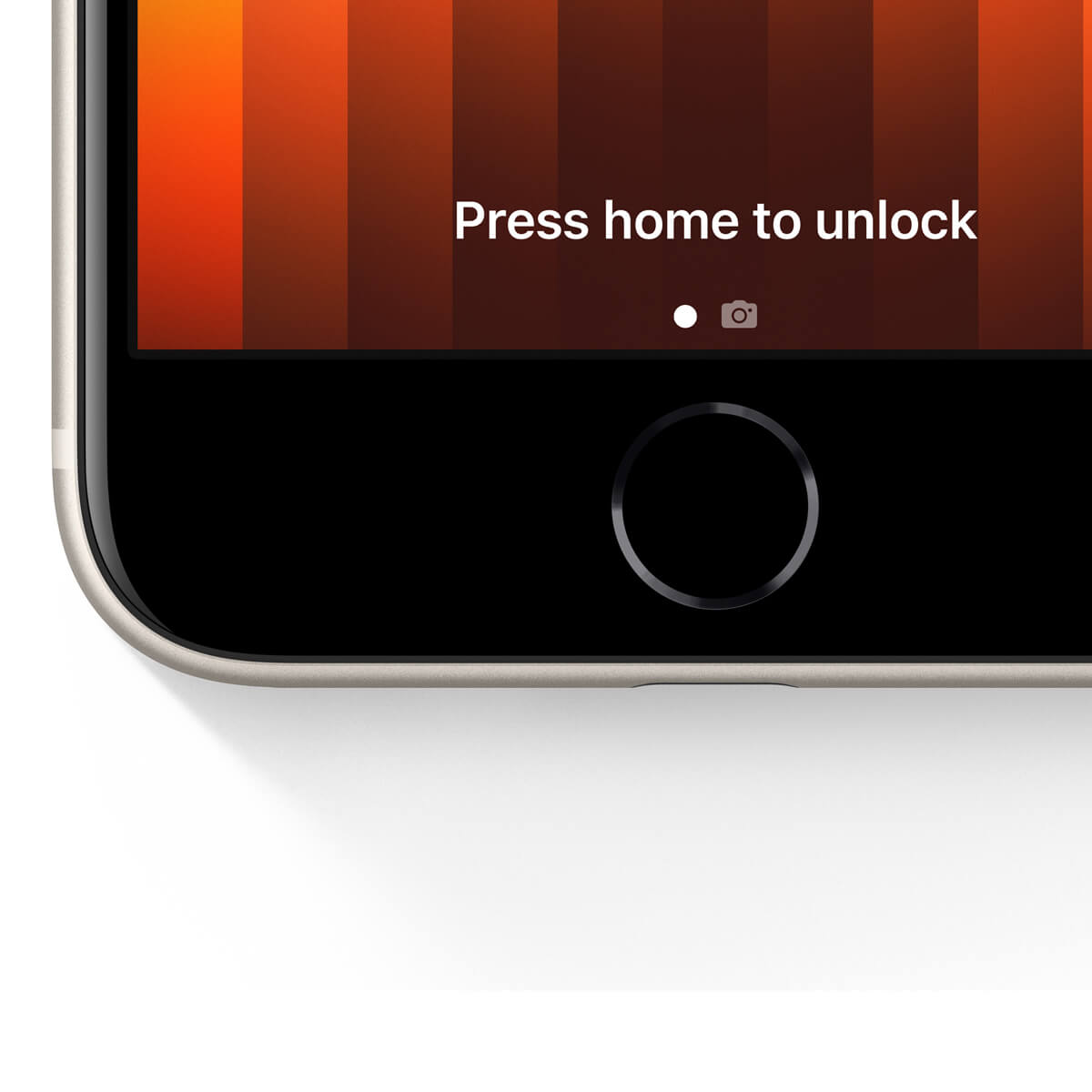 Touch ID – це швидкий, простий та безпечний спосіб розблокування iPhone SE 3 (2022) та входу до програми. Також ви можете використовувати його разом з Apple Pay, щоб робити покупки в Інтернеті або купувати продукти в магазині без картки.