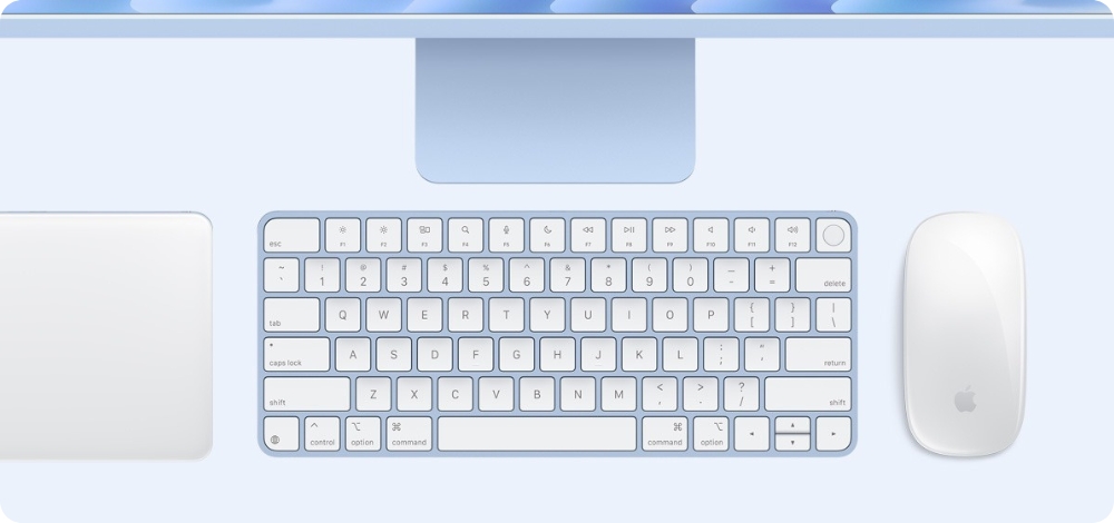 iMac включает клавиатуру и мышь в цвет устройства, теперь с портами USB-C для удобства зарядки. Magic Keyboard с Touch ID позволяет легко разблокировать устройство, выполнять платежи через Apple Pay, обеспечивая максимальное удобство и безопасность работы.