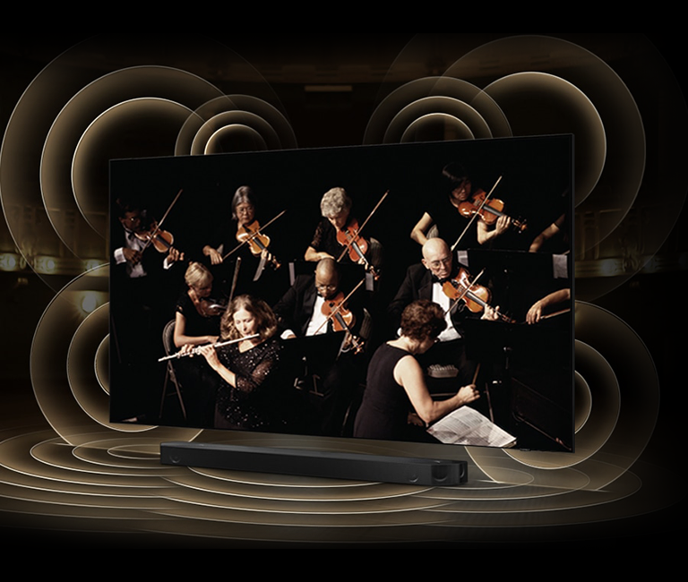 Оточіть себе гармонійним звучанням. Технологія Q-Symphony дозволяє відтворювати звук одночасно на динаміках телевізора та саундбара для отримання кращого ефекту об'ємного звучання.